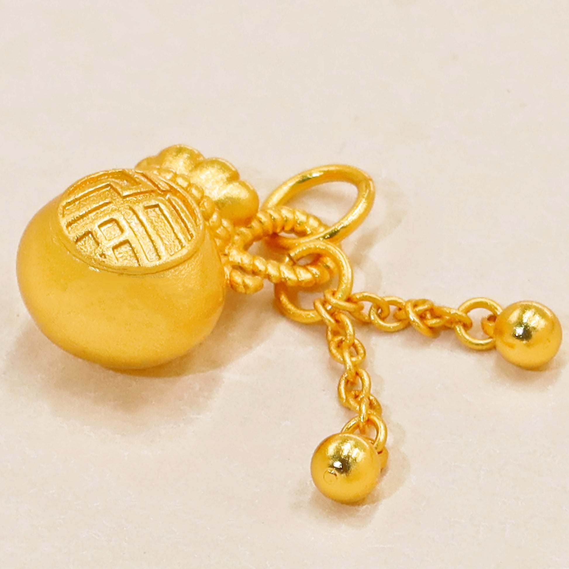 The Money Pocket Fu Gold Charm features the traditional Chinese character "Fu" (福), symbolizing blessings, fortune, and prosperity. Shaped as a money pocket, this Feng Shui charm amplifies the flow of positive energy, attracting good luck, financial opportunities, and harmony into your life. Perfect for those seeking a prosperous future, this charm embodies the traditional belief in blessings bestowed by ancestors, inspiring a happy and abundant life.